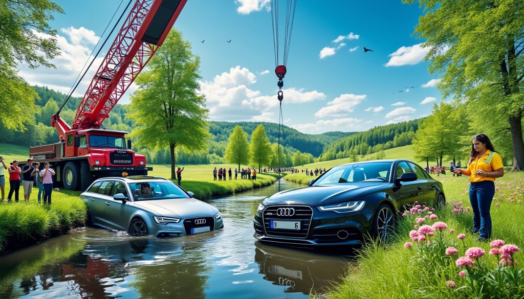 Il paraît que deux Audi, ces témoins de luxe de l’ingénierie allemande, ont perdu la tête. Une collision sur la départementale, suivie d’une glissade malencontreuse vers le néant aquatique. Dans leurs aventures, ces voitures haut de gamme n'ont sûrement pas prévu de faire un plongeon dans la nature. Deux modèles Audi, chacun pesant plusieurs centaines de kilos, ont fini comme des bouteilles en plastique sur un cours d’eau. Mais comment a-t-on pu en arriver là?
