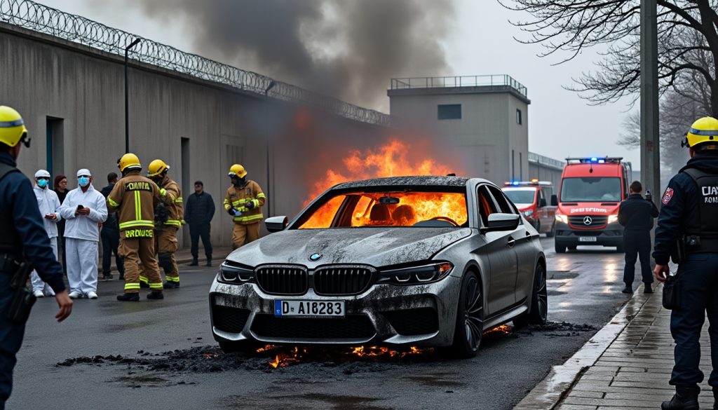 Cette voiture n’est pas seulement une BMW, c’est un symbole dans la société actuelle. On ne peut pas s’empêcher de penser que ce geste s’adresse aussi à l’image d’une certaine réussite, un étendard de ce que beaucoup désirent mais peu atteignent. Enflammée devant la prison, elle devient métaphore de ce que certains veulent dire sur la justice et la réclusion.